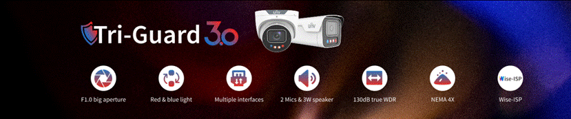 Uniview IP cameras, especially those with Tri-Guard technology, provide real-time monitoring and proactive security. Features include:
