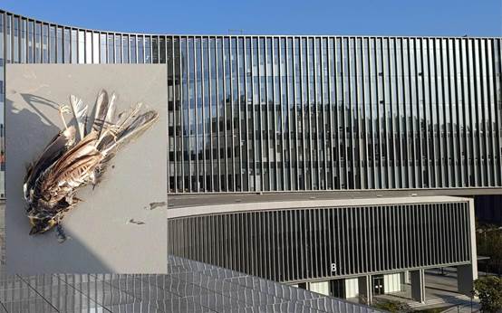 At the Uniview Headquarters, nine dead birds, mainly sparrows, were found, with one sparrow even shattering the glass upon impact. On-site analysis revealed that the fourth floor of the R&D building faces south, where sunlight casts shadows onto the glass curtain wall. Sparrows flying from the nearby woods collide here and fall onto the outer terrace of the fourth floor. These birds fly at low altitudes, typical of urban bird collisions.