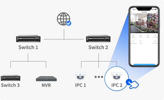 El switch UNV detecta automáticamente las cámaras IP y los NVR, generando una topología visual. Los usuarios pueden acceder a la interfaz de gestión del switch o ir directamente a las cámaras IP para ver la transmisión en vivo.