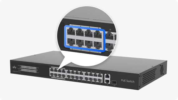 Los switches UNV admiten puertos prioritarios, lo que garantiza que, en casos de ancho de banda o energía insuficientes, los puertos con prioridad tengan preferencia para la transmisión de datos y el suministro de energía.