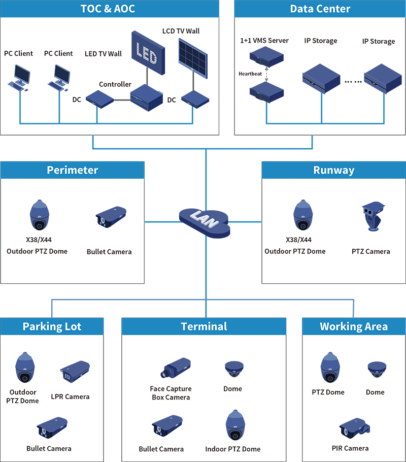 Uniview se consacre au secteur de la vidéosurveillance depuis de nombreuses années, au cours desquelles l’entreprise a accumulé une solide expérience et de vastes connaissances dans les plus grands aéroports. Aujourd’hui, Uniview propose une nouvelle solution de surveillance dédiée aux aéroports, offrant une efficacité, une fiabilité et une évolutivité redoutables. Elle fournit aux exploitants d’aéroports une base de données élémentaire pour des applications plus poussées, comme la perception de la situation, l’optimisation du service et l’analyse intelligente, pour exploiter au mieux l’aéroport.