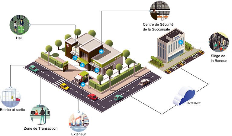 Une banque est une institution financière habilitée à recevoir des dép?ts et à prêter de l’argent. Ce type d’établissement abrite des installations importantes comme des DAB et des coffres, et il accueille quotidiennement de nombreux clients. Une solution de vidéosurveillance bancaire complète doit ainsi prendre en compte tous ces facteurs. Elle doit couvrir tous les espaces critiques sans angles morts et permettre une gestion unifiée au niveau du siège.