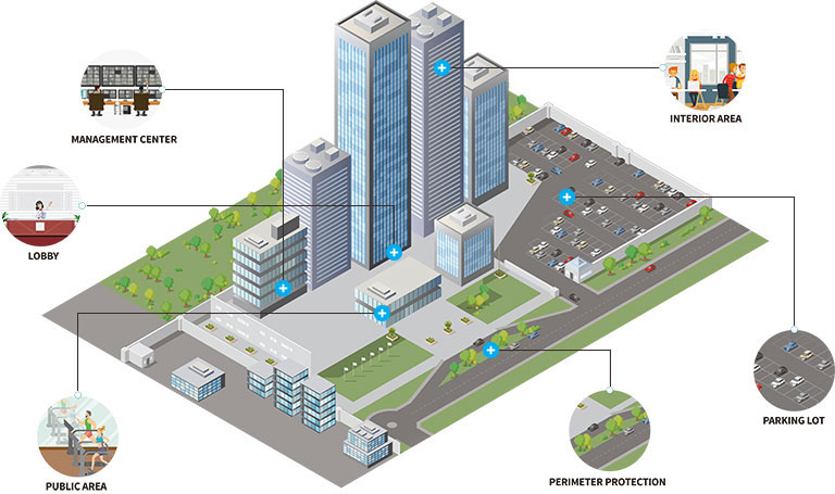 Bangunan merupakan tempat kegiatan sosial seperti kegiatan ekonomi, produktif, budaya dan hiburan. Solusi pengawasan bangunan yang komprehensif dan canggih harus mempertimbangkan aktivitas sosial dan perilaku pribadi tertentu. Bangunan perlu melindungi privasi individu, tetapi juga harus mampu mencakup semua area penting tanpa ada titik yang terlewat.