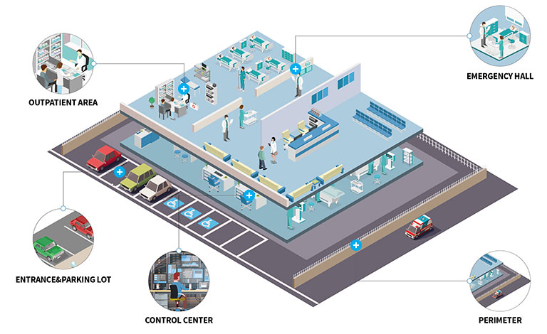 Медицинское учреждение представляет собой открытое пространство, в котором находятся пациенты, посетители и персонал. Рабочие и открытые зоны не отделены друг от друга, что усложняет задачу по обеспечению безопасности в больницах. Таким образом, устройства и системы видеонаблюдения должны соответствовать отдельным сценариям их развертывания. Например, в отделениях неотложной помощи и в зонах обслуживания амбулаторных пациентов требования к таким системам будут отличаться.